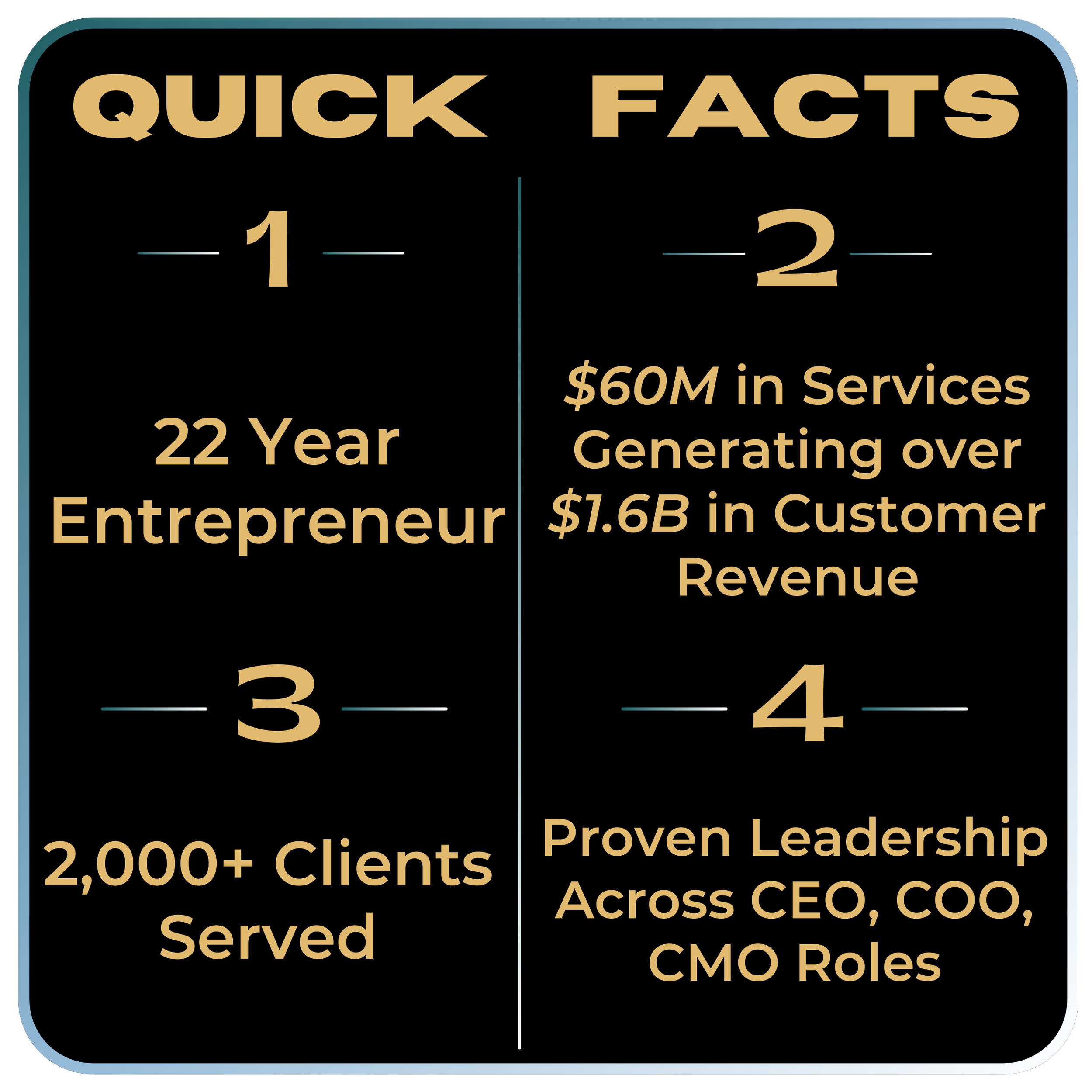 With over $60M in client services delivered, producing over $1.6B in customer revenue, serving more than 2,000 clients, I guide companies through pivotal growth opportunities through both strategy and execution.
